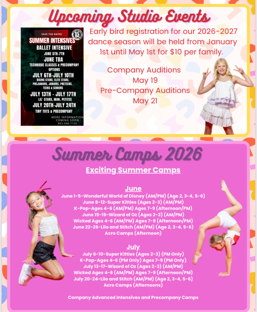 **Fall 2025-2026 schedule is open for registration!** Please do not hesitate to contact us if you have any questions about our class schedule or if you can not find a class that suits your needs. Our classes run on a 10 month calendar, beginning in August with a year end performance in May. We look forward to having you as a part of our SC Dance Company family!
