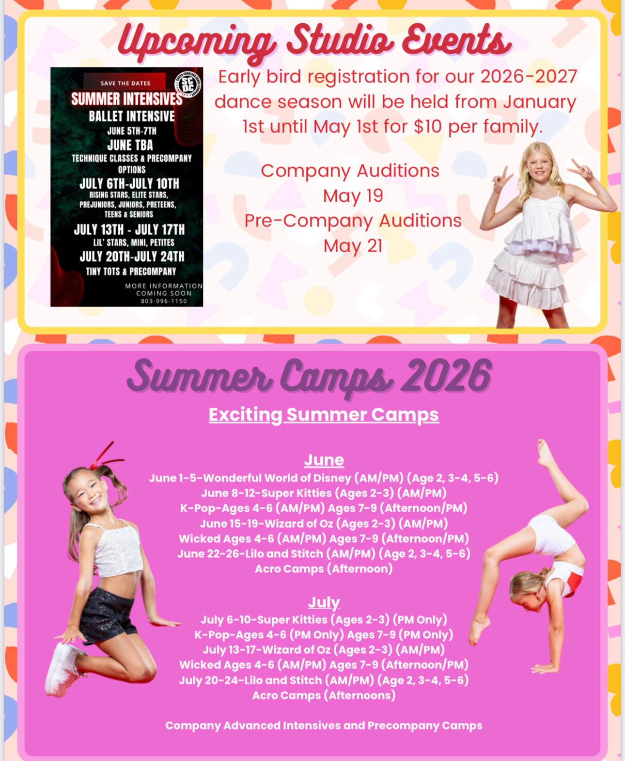 2026 Summer Camp registration is NOW OPEN! In the schedule below, our classes are listed by the type of camp genre. Please do not hesitate to contact us if you have any questions about our class schedule or if you can not find a class that suits your needs. We look forward to having you as a part of our SCDC family!